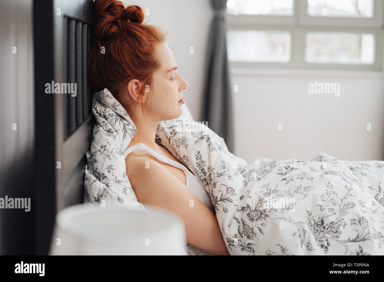 Beautiful Young Girl Sitting In Bed With White Pillow And Smiling